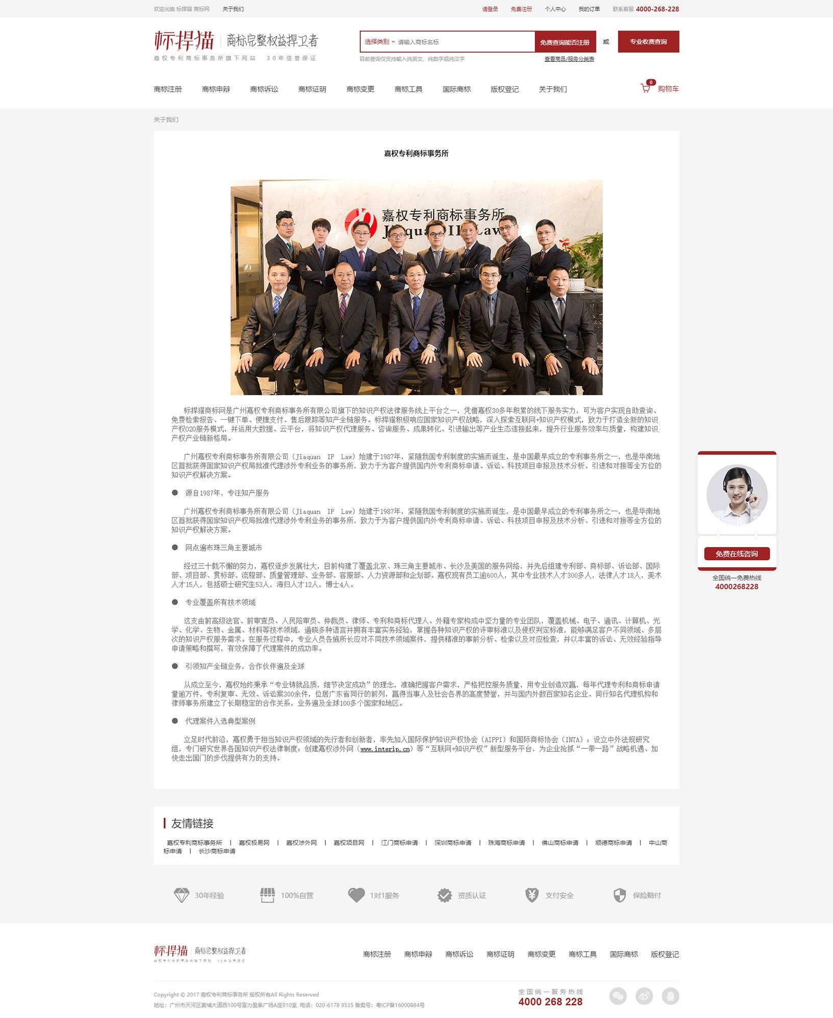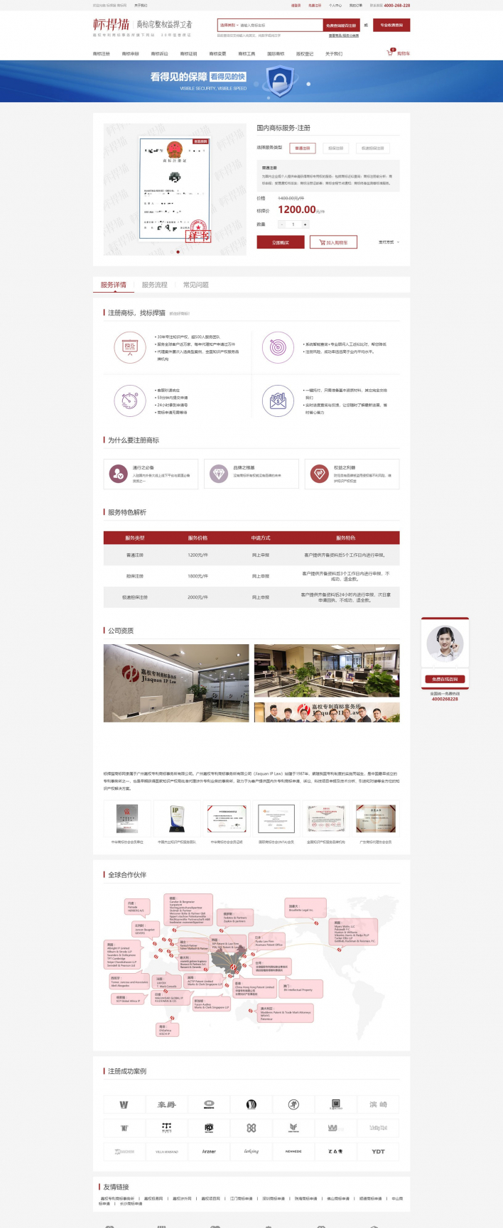 標(biāo)捍貓商標(biāo)網(wǎng)是廣州嘉權(quán)專利商標(biāo)事務(wù)所有限公司旗下的知識產(chǎn)權(quán)法律服務(wù)線上平臺之一,憑借嘉權(quán)30多年積累的線下服務(wù)實力,可為客戶實現(xiàn)自助查詢、免費檢索報告、一鍵下單、便捷支付、售后跟蹤等知產(chǎn)全鏈服務(wù)。標(biāo)捍貓積極響應(yīng)國家知識產(chǎn)權(quán)戰(zhàn)略,深入探索互聯(lián)網(wǎng)+知識產(chǎn)權(quán)模式,致力于打造全新的知識產(chǎn)權(quán)O2O服務(wù)模式,并運用大數(shù)據(jù)、云平臺,將知識產(chǎn)權(quán)代理服務(wù)、咨詢服務(wù)、成果轉(zhuǎn)化、引進輸出等產(chǎn)業(yè)生態(tài)連接起來,提升行業(yè)服務(wù)效率與質(zhì)量,構(gòu)建知識產(chǎn)權(quán)產(chǎn)業(yè)鏈新格局。
